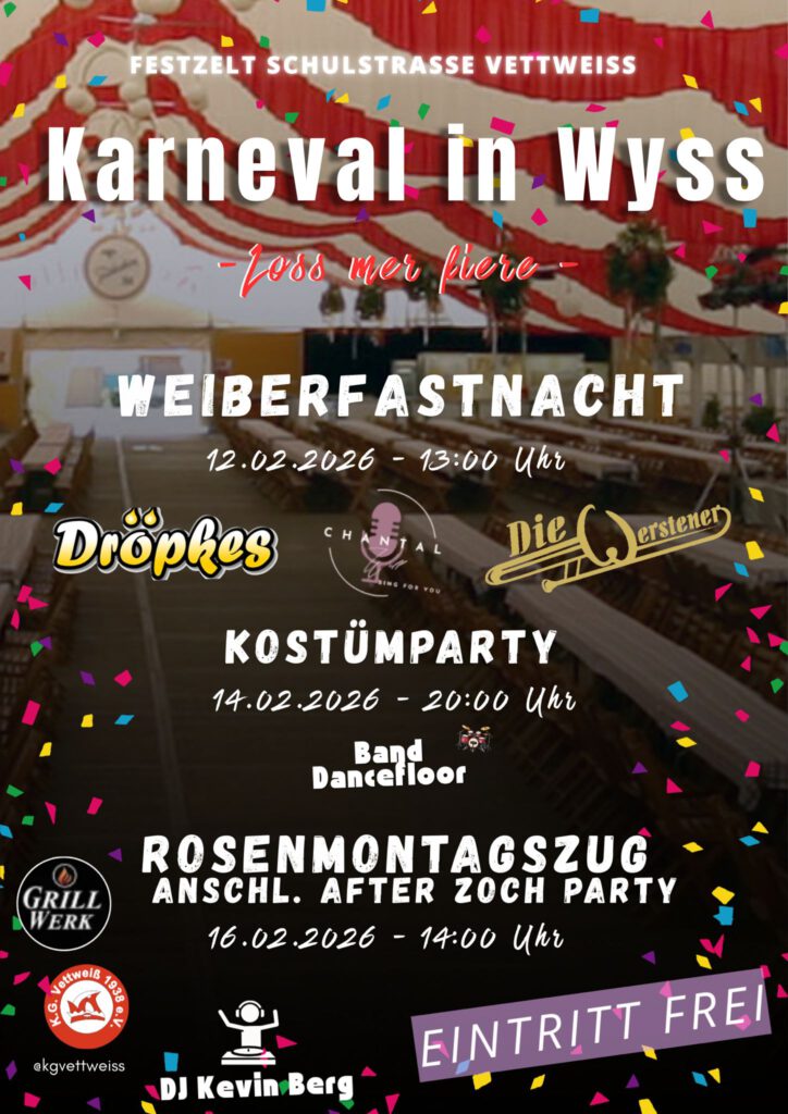 Im Festzelt Schulstraße Vettweiß erwartet euch der Karneval in Wyss 2026 mit bester Stimmung, Musik und jeckem Programm.